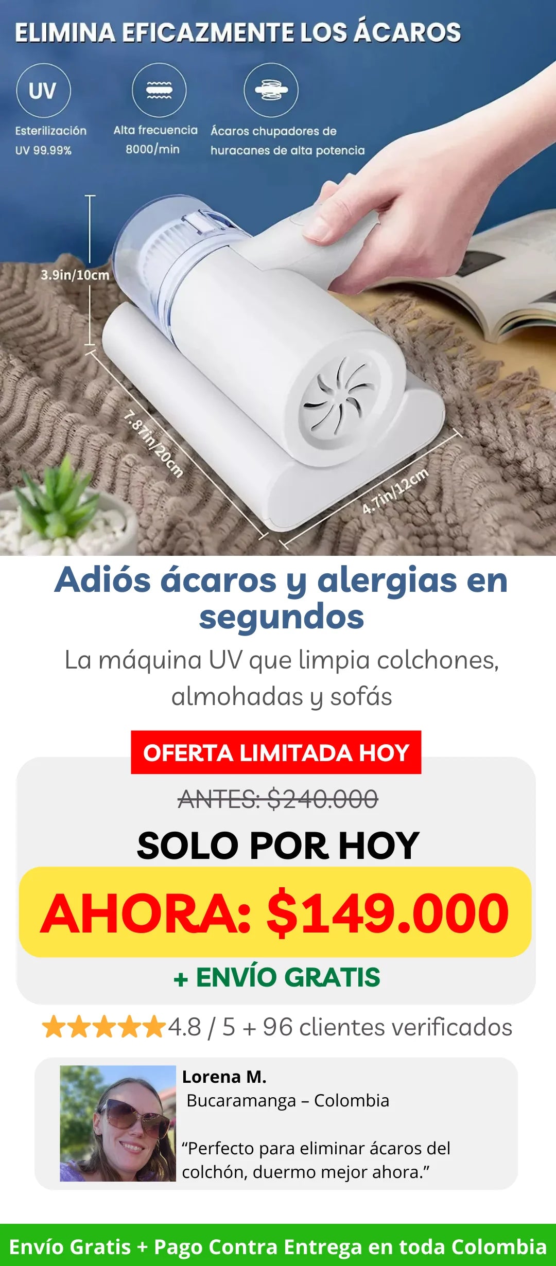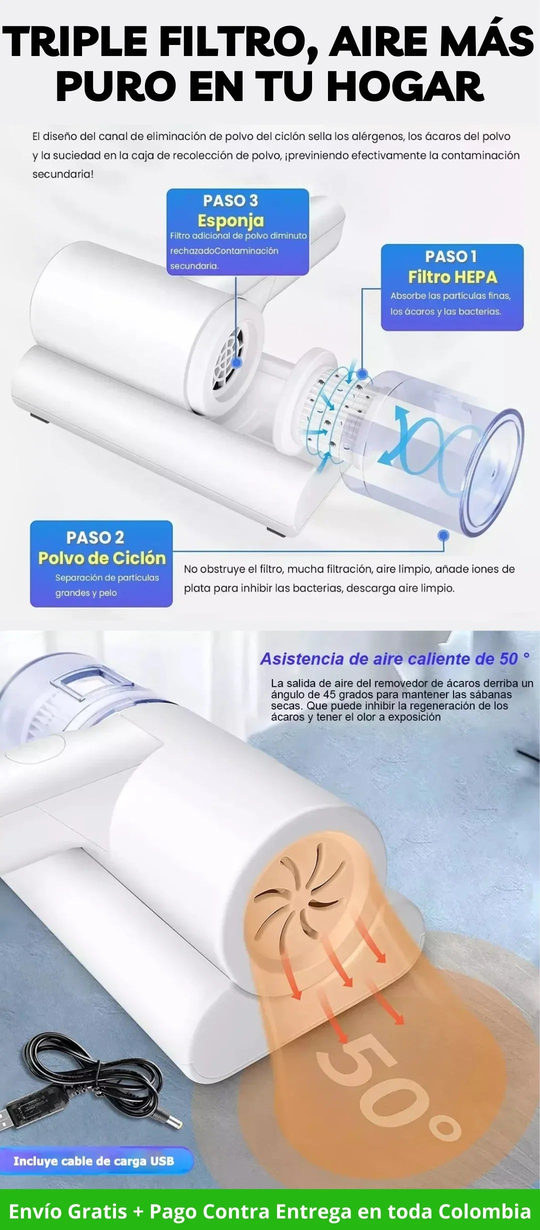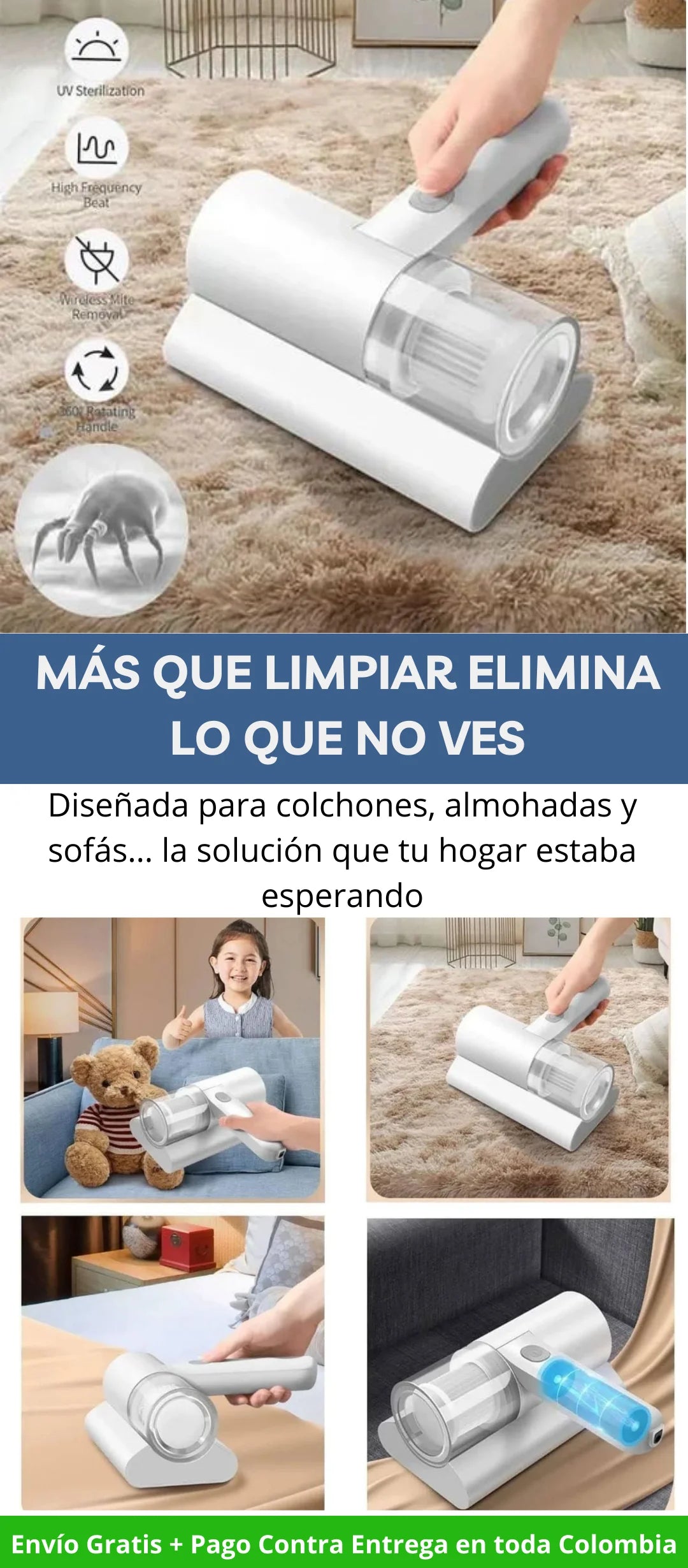 Utiliza esterilización UV y succión potente para eliminar ácaros y alérgenos eficientemente.